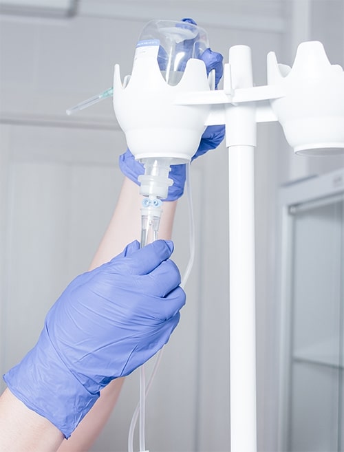 Инфузионная терапия позволяет эффективно и максимально быстро доставить в кровоток лекарственные средства внутривенным путём, поэтому именно её специалисты используют, чтобы прервать запой или для снятия симптомов похмелья. Состав капельницы профессиональный нарколог определяет на месте индивидуально, опираясь на результаты экспресс-диагностики, а также взятых анализов, которые проверяются на месте в выездной мобильной лаборатории. Если длительность запоя большая, для купирования тяжёлых симптомов абстиненции назначают: